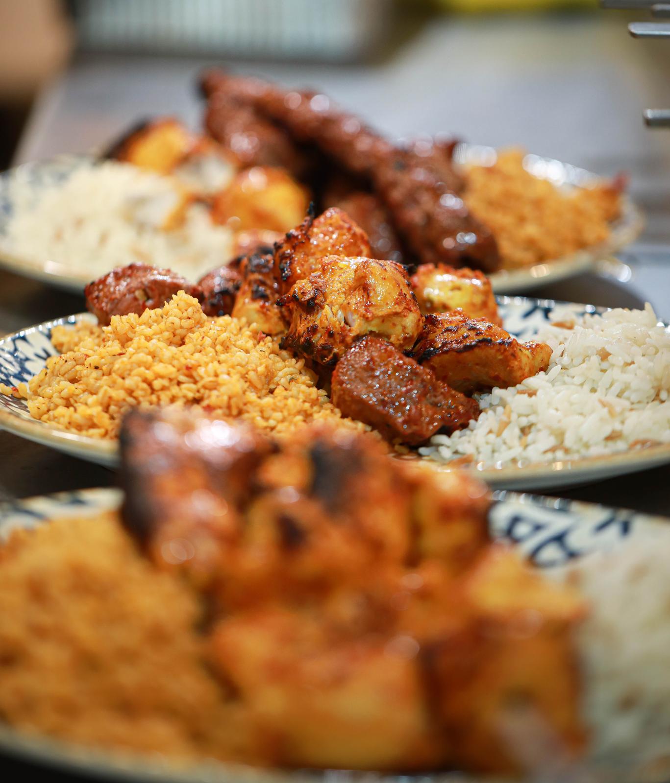 Korean Chicken Skewers, Basil Hummus Platters, Grilled Fish Filltet