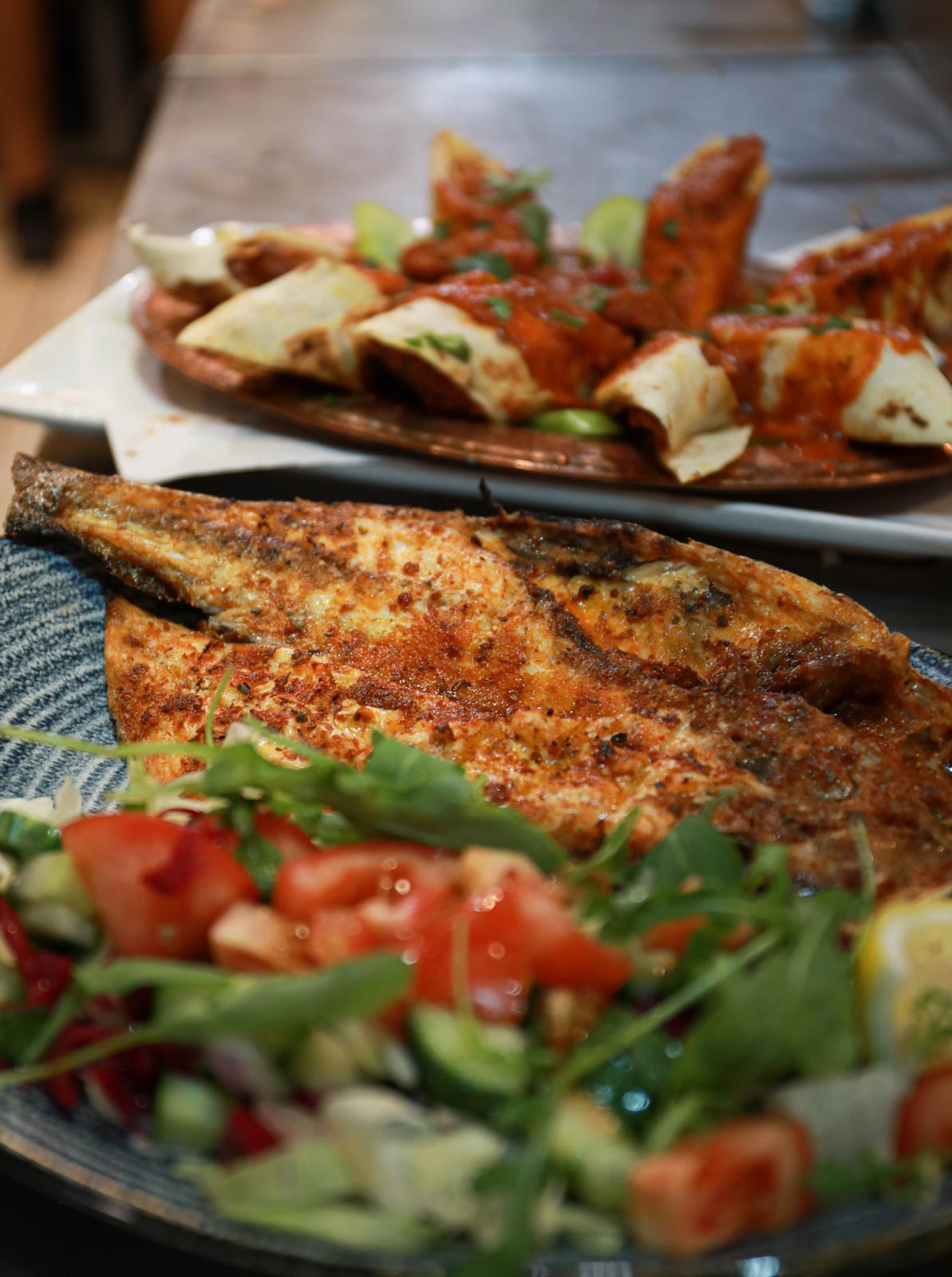 Korean Chicken Skewers, Basil Hummus Platters, Grilled Fish Filltet