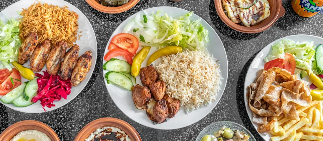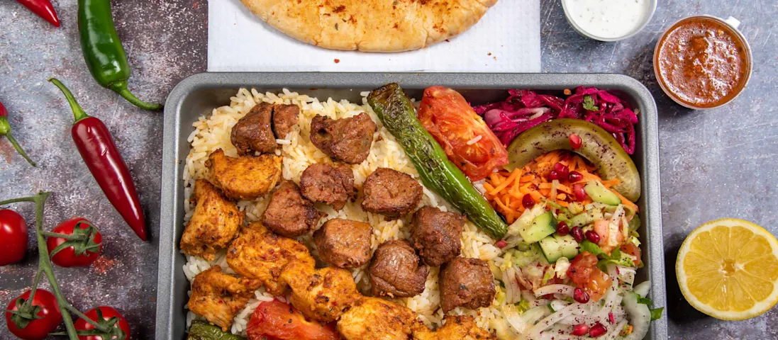 Korean Chicken Skewers, Basil Hummus Platters, Grilled Fish Filltet