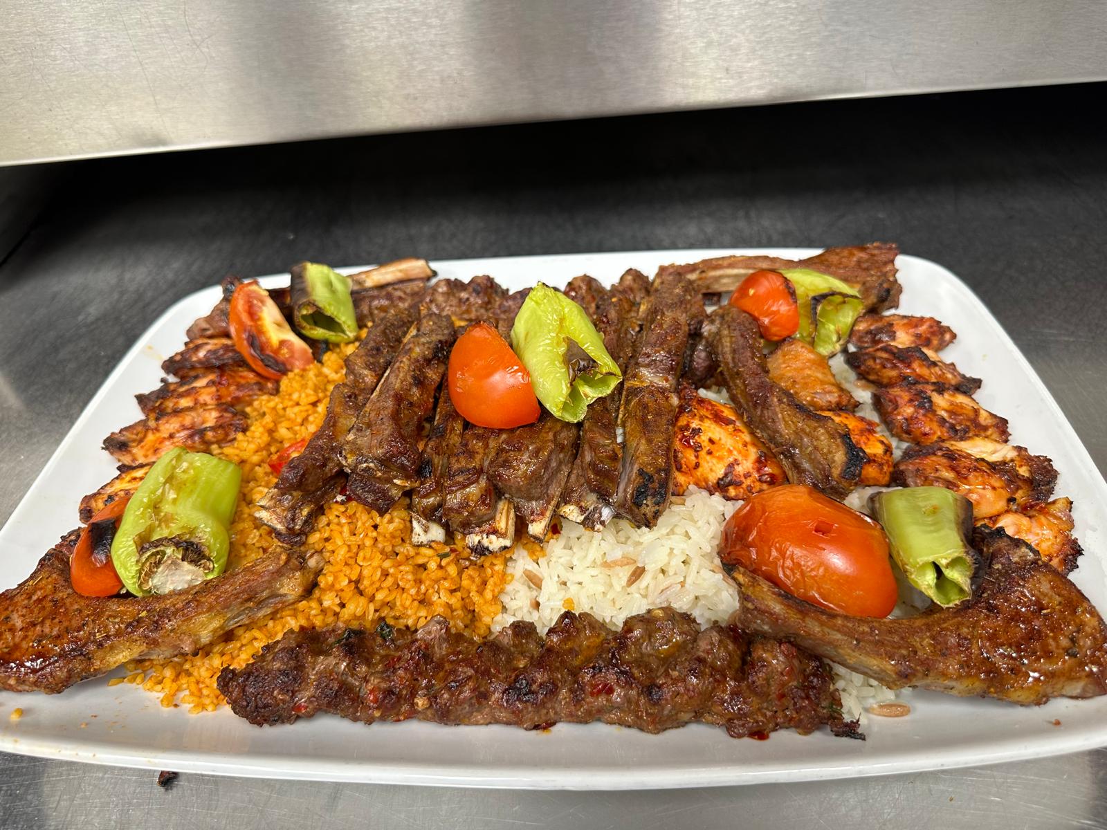 One skewer of shish kofte, shish, chicken kebab and lamb doner served with box salad and pitta on side Separately = white onion, lettuce , red cabbage, sliced Gherkin , fresh tomatoes with chili peppers/choice of sauce