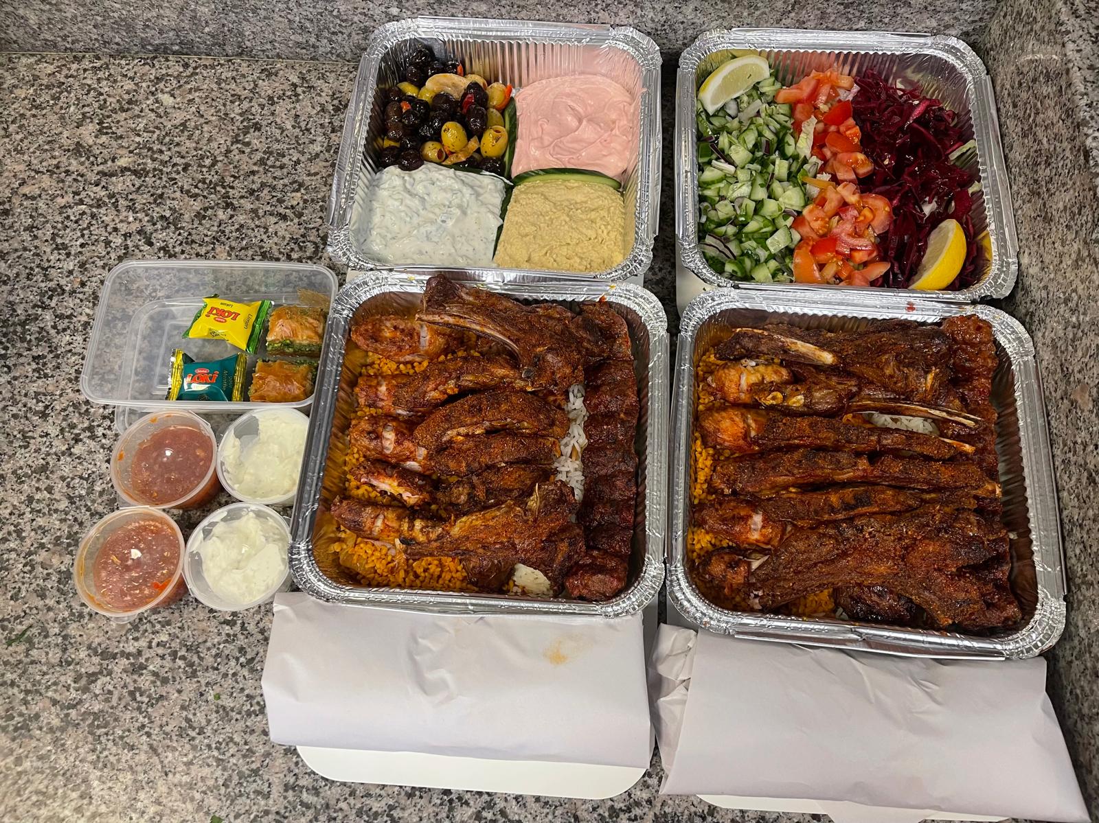 Lamb shish kebab- chips-salad-pitta-onion rings plus baklava all in Flat box with choice 2 sauce’s on top .Any special request anything separate will be charged at usual menu Prices